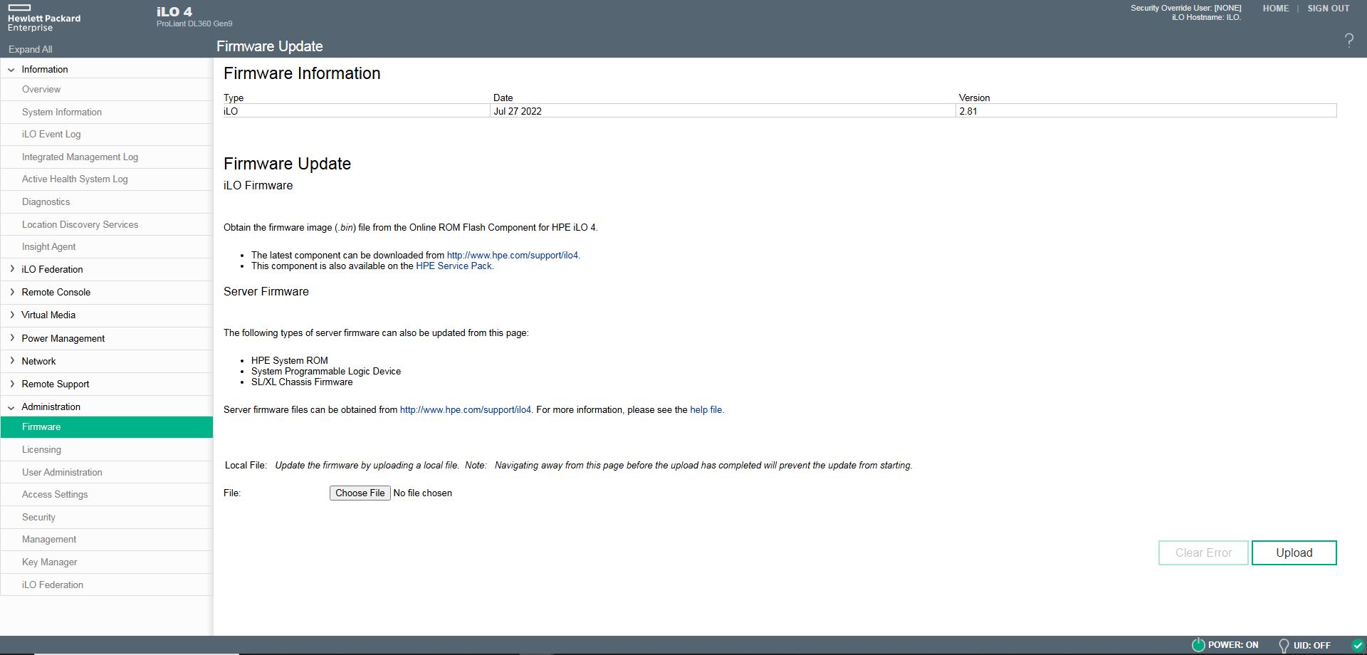 وارد پنل تحت وب iLO شده، فایلی که دانلود کردید را از منوی administration/firmware در قسمت Choose File انتخاب کنید و سپس Upload را بزنید و اجازه دهید خود سرور کار بروزرسانی را انجام دهد: